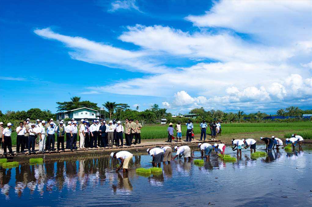 隨後,在我農技團黃團長引導下,總統參觀稻作示範區,對索國民眾學會如何插秧,感到相當欣慰,並肯定我農技團平日在索國的努力與辛勞。