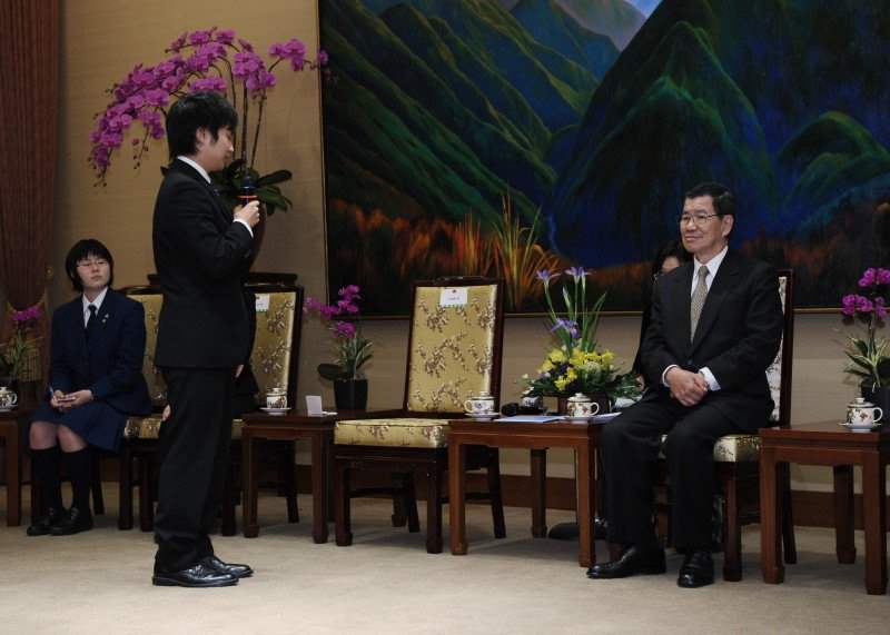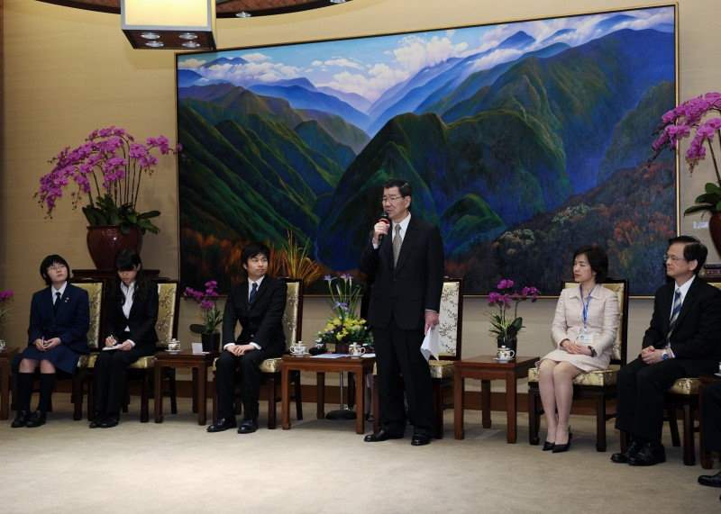 副總統首先恭喜得獎學生,並對日本產經新聞與新聞局合辦「台日文化交流青少年獎學金」計畫,表達感謝之意。副總統說,這個活動非常有意義,讓日本各大學的青年學生有機會瞭解中文正體字及台灣的風俗民情,對促進兩國青年朋友之間的交流,非常有幫助。