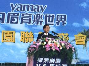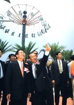當然,這項政策要能順利推動,除了政府的規劃之外,更需要民間資金及人力的參與,而月眉遊樂世界就是在這樣的理念之下,由國家大力推動的重大經濟建設。為了要借重民間的效率和專業,當初選定BOT的方式,在后里月眉台糖所有的這個美麗所在來興建。經過楊董事長所領導的長億關係企業這幾年來的規劃和開發,以及各級政府和地方鄉親的支持,今日,我們已經看到初步的成果。這個園區無論是在規劃、設計、營運、交通以及氣候等等方面,都有國際的水準。讓鄉親們不必出國,就可以很快、很方便的享受到國際水準遊樂設施。尤其重要的是,園區本身的建設,為地方創造了就業機會、貢獻稅收,也帶來了繁榮。相信因為月眉育樂世界的開發,我們地方將來一定有機會能夠像美國的佛羅里達州一樣,因為迪士尼遊樂區在當地的開發,帶來全區域的繁榮和富庶。