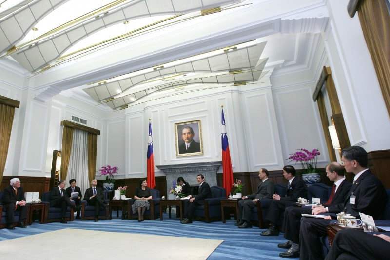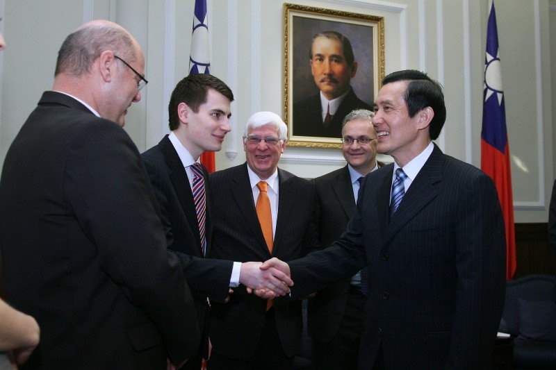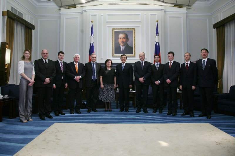 歐洲議會友台小組訪問團團長Laima Liucija Andrikiene(歐洲議會友台小組副主席、人權委員會副主席、國貿委員會委員)、Mario Mauro(歐洲議會議員、外委會委員)、Salvatore Iacolino(歐洲議會議員、內政委員會副主席)、Bastiaan Belder(歐洲議會「自由暨民主歐洲黨團」副主席、外委會委員)等人,上午由外交部次長沈呂巡、歐洲經貿辦事處長李篤(Guy Ledoux)陪同,前來總統府晉見總統,國家安全會議秘書長胡為真也在座。