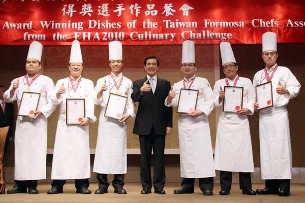 馬英九總統今天晚間出席「新加坡2010年亞洲廚藝大賽」我國得獎選手作品餐會,頒發感謝狀給得獎選手並致詞。