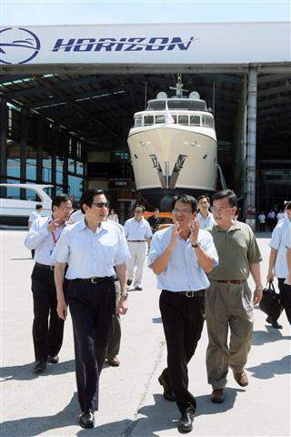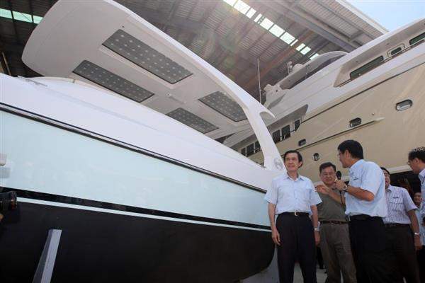 總統抵達嘉鴻遊艇公司後,首先參觀該公司製造的大型遊艇及太陽能遊艇,親自體驗我國遊艇產業的傑出工藝,並聽取遊艇公會呂佳揚理事長及經濟部工業局簡報,瞭解遊艇工業的發展現狀與業者需求。