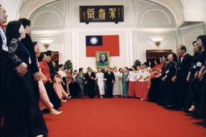 陳總統水扁先生今天下午在總統府大禮堂接見參加「總統盃全球僑胞混聲合唱觀摩賽」人員,總統在致詞時除歡迎他們自僑居地回到故鄉台灣外,也與訪賓們一起合唱「雙人枕頭」及「高山青」兩首歌曲。