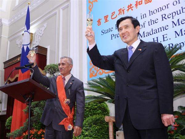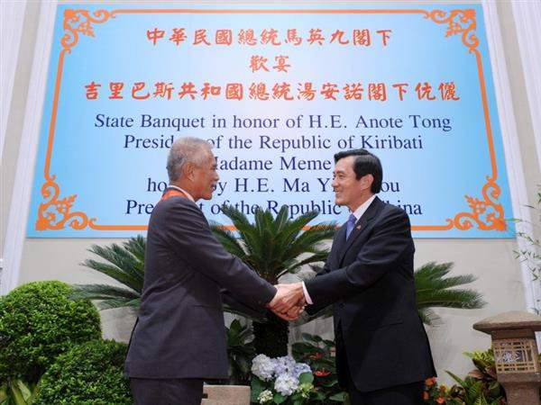 馬英九總統今天晚間偕蕭萬長副總統以國宴款待吉里巴斯共和國湯安諾總統伉儷,並在宴前頒贈「采玉大勳章」予湯安諾總統,表彰他促進兩國邦誼的貢獻與付出。
