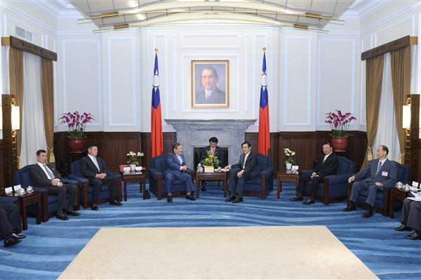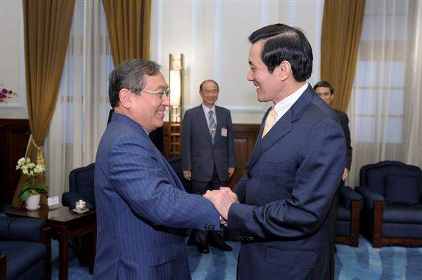 大前研一博士、日本秋田縣知事佐竹敬久等人,上午由經濟部長施顏祥陪同,前來總統府晉見總統,國家安全會議秘書長胡為真、財團法人海峽交流基金會董事長江丙坤也在座。