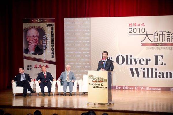 蕭萬長副總統今天上午出席由經濟日報所主辦的「2010年大師論壇──2009年諾貝爾經濟學獎得主威廉森博士(Dr. Oliver E. Williamson)專題講座」,並感謝主辦單位邀請威廉森博士來台發表「企業從交易成本學到什麼」專題演講,以交易成本經濟學的角度,分享他對全球景氣與經濟金融治理的看法,同時期盼威廉森博士為當前迫切的金融改革議題指引方向。