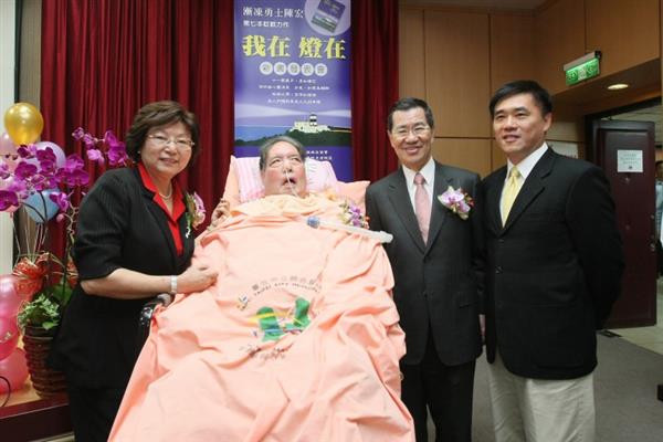 蕭萬長副總統今天上午出席「國際漸凍人日暨陳宏新書發表會」,親自頒贈紀念獎章給陳宏老師,陳老師則透過眨眼的方式,回贈副總統「萬事長青」的祝福,場面溫馨感人。