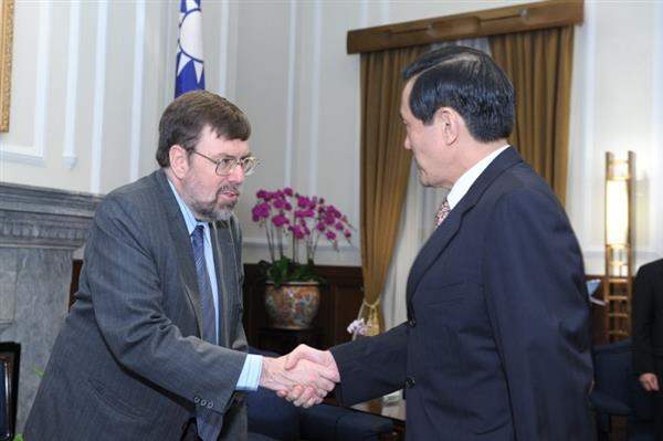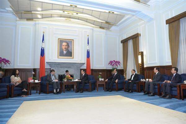 薛瑞登伉儷下午由外交部長楊進添陪同,前來總統府晉見總統,國安會諮詢委員董國猷也在座。