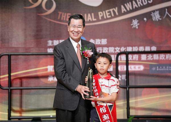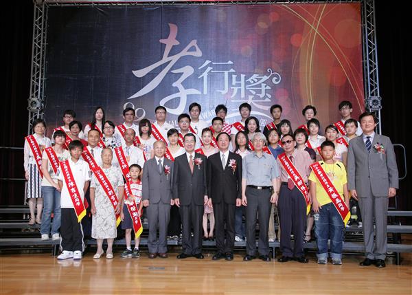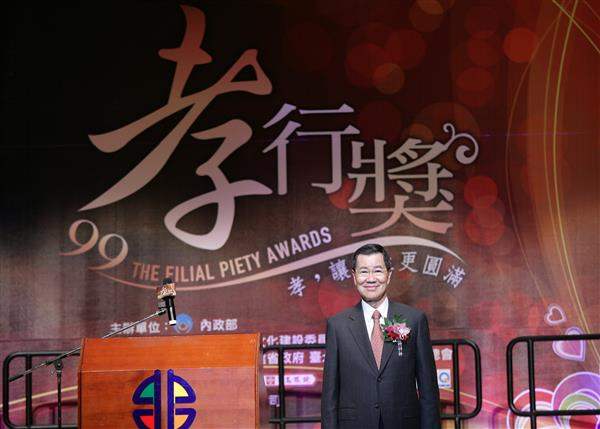 蕭萬長副總統今天下午在內政部長江宜樺、臺北縣長周錫瑋等人陪同下出席「99年全國孝行獎表揚典禮」。副總統致詞表示,「孝道」是我國傳統固有的倫理道德,「行孝道、讓人生更圓滿」,而「百善孝為先」,要做好事、先從孝順尊長做起。政府舉辦全國孝行獎,具有激勵社會的作用,藉由表揚全國孝行楷模,希望國人共同建立現代孝道倫理,相信必能帶給社會正面、良善與安定的力量。