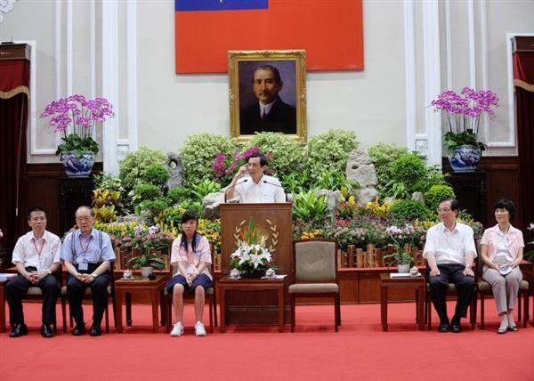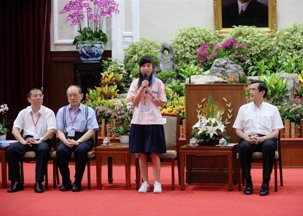 得獎學生一行下午由教育部長吳清基陪同,前來總統府晉見總統,總統府副秘書長劉寶貴也在座。