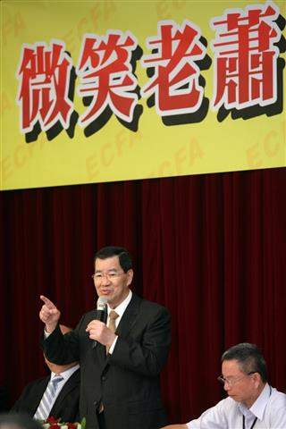 蕭萬長副總統今天上午由行政院衛生署長楊志良、經濟部次長梁國新等人陪同,專程前往台中市出席由台中市磐石會、台中市商業總會、台中市工業區廠商協進會及台中市工業會所主辦的「與副總統有約—台中市工商業界座談會」。會中,副總統除闡釋簽訂「兩岸經濟協議」(ECFA)對台灣未來經濟發展的影響外,並聽取台中市長胡志強及工商業界代表們的各項建言。副總統說,藉由簽署ECFA的助力,改善我國產業的體質,讓產業轉型與升級提升競爭力,希望業界都能朝這方向共同來努力,以迎接新挑戰與新機會的來臨。