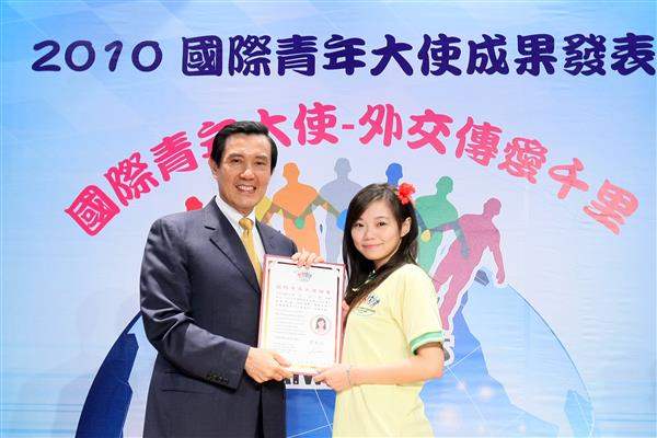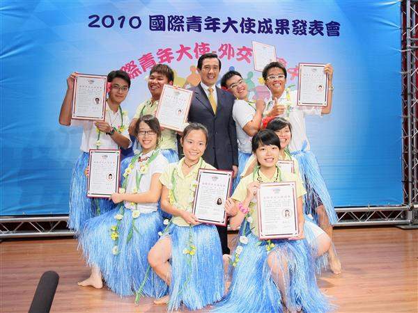 馬英九總統今天上午出席外交部「國際青年大使交流計畫」成果發表會,除親自頒發國際青年大使證書給參與同學,並肯定此計畫的成效及青年學子的熱情與創意,不僅為國家推動文化外交,更充分發揮台灣的軟實力,將友誼與愛心傳送到友邦。