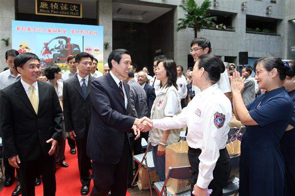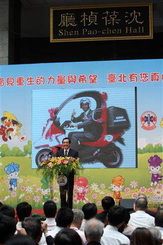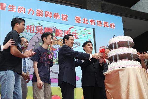 馬英九總統今天上午出席台北市政府舉辦的「金鳳凰專責救護隊--看見重生的力量與希望,臺北有您真好」感恩活動,親自頒獎給醫療顧問與歷年來捐贈救護車、裝備器材及經費有功人員,並與郝龍斌市長共同切蛋糕,慶祝「到院前心肺功能停止(OHCA)」康復民眾的重生。