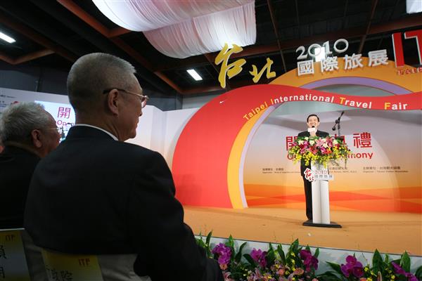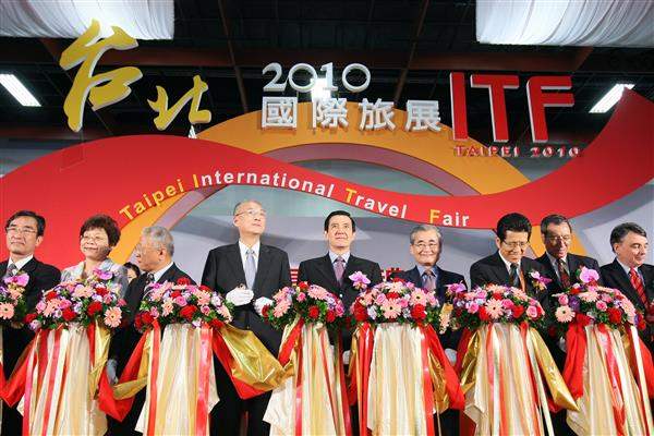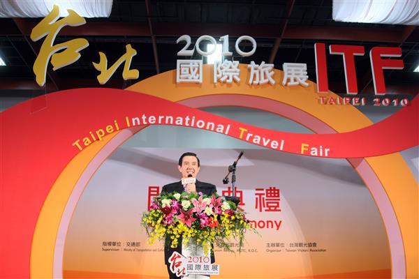 馬英九總統上午在行政院長吳敦義、交通部長毛治國、台北國際旅展籌備委員會主委嚴長壽等陪同下,出席「2010台北國際旅展」(ITF)開幕典禮,除向全世界傳達台灣觀光產業的創新與活力,也宣示今年將是台灣觀光業的破紀錄年。