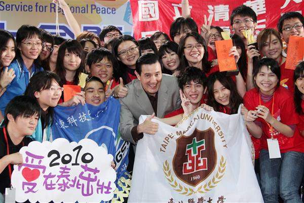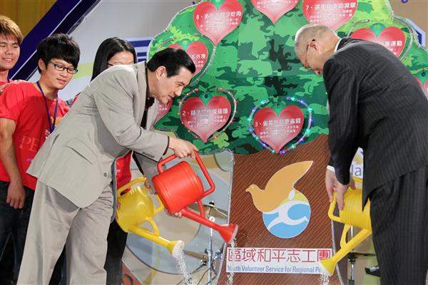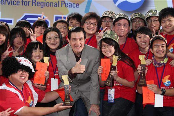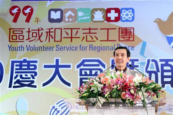 馬英九總統今天上午出席99年「區域和平志工團」團慶大會暨頒獎典禮,親自頒發「環境服務類」與「國際服務類」獎項予獲獎青年志工績優團隊,並勉勵青年志工們繼續幫助別人、磨練自己,對國家社會做出貢獻。