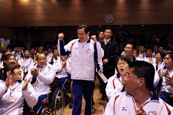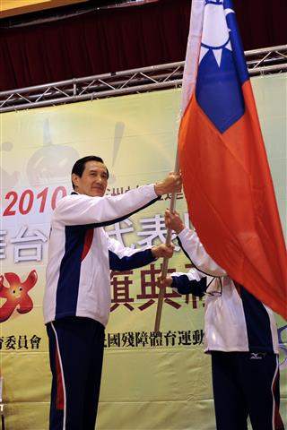 馬英九總統今天下午前往行政院體委會出席「廣州2010年亞洲帕拉運動會」我國代表團授旗典禮時強調政府將逐步改善身障運動員的環境及待遇,並勉勵選手為國爭光,為自己打造光明前途。