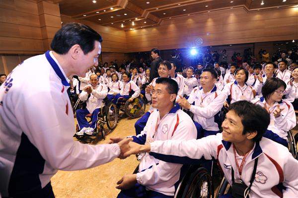 總統表示,他一向重視身障者的體育活動,在台北市長任內除邀請身障族群參與各類活動,也曾比照一般選手的標準發放身障選手獎金,希望未來能逐步提高金額,讓身障選手共享榮耀。此外,體委會在亞洲帕運已放寬過去「必須有5國、5人參賽」始給予獎勵的規定,現在只要獲得前三名即給予獎勵(倘僅3人參賽,成績為第三名者,則不予獎勵),獎金額度則分別為金牌38萬元、銀牌23萬元及銅牌15萬元,政府希望藉此表達對身心障礙選手的重視。