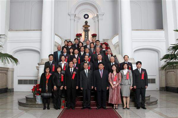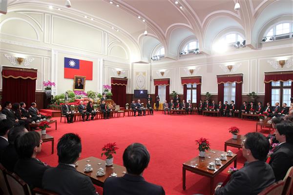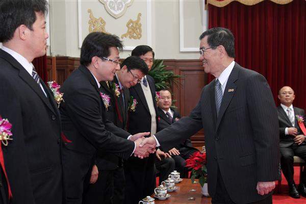 得獎建築企業代表冠德建設董事長馬玉山等一行,上午由「國家金質獎」徵選活動主任委員顏清標陪同,前來總統府拜會副總統。