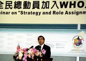 首先,個人很高興受邀參加今天的研討會,與各位先進及貴賓齊聚一堂,共同為推動台灣加入「世界衛生組織」(WHO)集思廣益。在此本人願特別代表政府向各位長期以來,不辭辛勞努力推動台灣加入WHO所作的犧牲與奉獻,表示最誠摯的敬意與謝意。