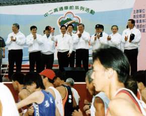 今天阿扁來到南投參加由中華奧會、交通部國道新建工程局及南投縣政府共同主辦「奔馳在城鄉的動脈∣中二高通車前系列活動」,心裡感到特別高興,因為它象徵南投地區第一條高速公路即將完工通車,高效率、高品質的運輸系統即將呈現在各位眼前,將帶給南投地區無限的發展契機。