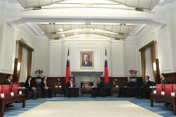 訪賓一行由香港「東華三院」董事局主席梁定宇帶領、行政院大陸委員會副主委劉德勳陪同,前來總統府晉見總統,國家安全會議副秘書長劉志攻也在座。