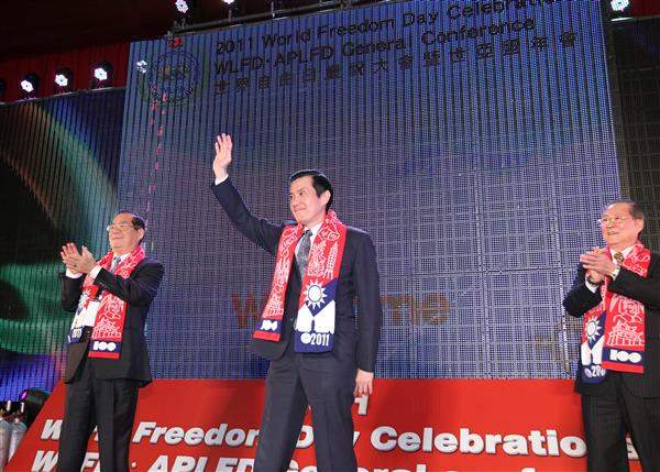 馬英九總統今天下午出席「2011年世界自由日慶祝大會暨世亞盟年會」, 代表我政府與人民歡迎各國貴賓齊聚台北,共同見證自由、民主與人權等普世價值在全球各地蓬勃發展。