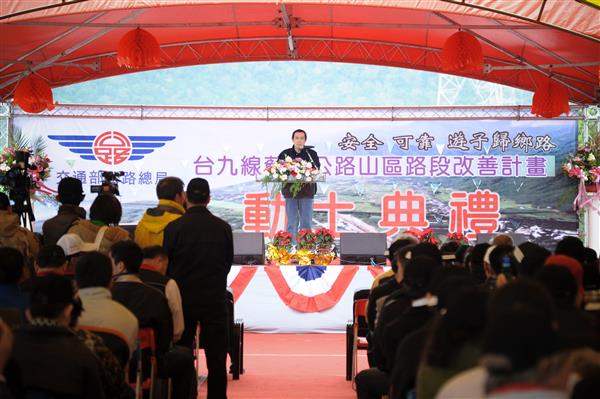 總統致詞時首先以太魯閣族語、阿美族語及泰雅族語向在場民眾問好,對「蘇花公路改善計畫」(簡稱「蘇花改」)順利動工,除表達欣慰之意,也肯定有關部會的努力。總統指出,「蘇花改」的動工代表政府重視東部地區的發展,過去東部的開發太慢、太少,不過自前年12月起,政府開始逐步推動東部鐵路電氣化與雙軌化,希望未來東部民眾也能享受西部民眾的待遇與福利。