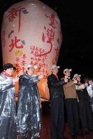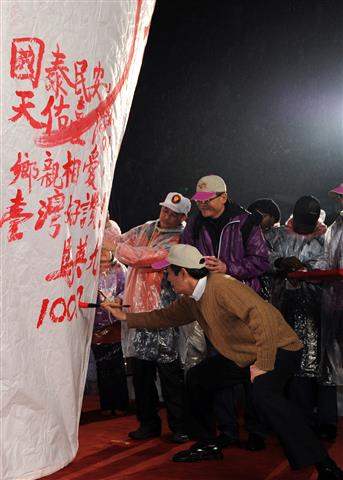 馬英九總統今天晚間前往新北市平溪國中出席「希望臺灣、新北好Young:2011新北市平溪天燈節」,在高達20呎的大型天燈上題字,祈願「國泰民安、天佑台灣、鄉親相愛、台灣好讚」。