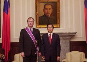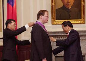陳總統水扁先生今天頒授「紫色大綬景星勳章」給荷蘭國會議員兼國際自由聯盟副主席范伯倫先生,以表彰其對促進中荷兩國友好合作關係的付出與貢獻。