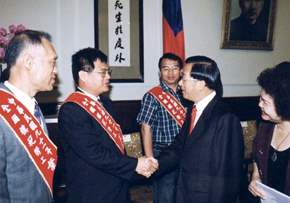 九十一年全國模範勞工彭豐柱等人上午由行政院勞委會主委陳菊陪同,前來總統府接受總統親自道賀。總統府副秘書長陳哲男也在座。