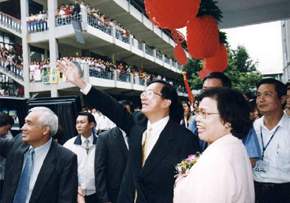 日前英國倫敦政經學院紀登斯院長應邀來台灣演講時,曾指出「第三條路」是為了因應全球化、知識經濟、個人主義等三個趨勢發展之下,所產生的策略;同時,他也強調每個國家走第三條路的方式都不同,各自可以用本土的方式來實踐。阿扁在競選總統時,即提出台灣的新中間路線,以爭取二千三百萬台灣人民的認同和支持。就任總統後,也致力於倡導民間與政府的夥伴關係,積極推動志工台灣以及政府改造等各項工作,希望能引領台灣走出自己的路,實現「新中間路線」的理念。今天阿扁看到彰化高中有長期輔導學弟妹的校友志工「小蝸牛服務隊」;熱心協助校務發展的「家長會長團」,以及積極參與社會服務的學生社團,深深地感受到彰中的校友、家長及師生同仁們以實際行動從事關懷學校、服務人群的工作,正是體現「志工精神」,落實「志工台灣」的具體展現,令人敬佩。