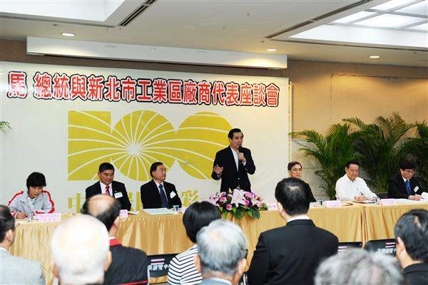 馬英九總統中午前往五股工業區與新北市工業區廠商代表座談,瞭解廠商的需求與意見,並於聽取經濟部工業局有關新北市工業區的更新績效簡報後,指示中央與地方政府充分配合,盡量協助廠商有更多的發展機會。