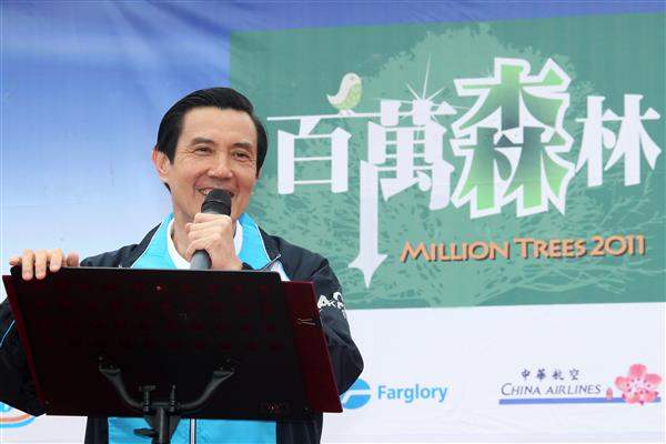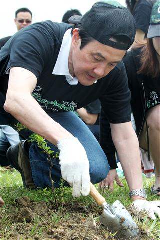 馬英九總統今天上午出席「2011年百萬森林-福德坑原生植物教育園」復育計畫活動,除授旗予多所大學同學們所組成的「綠色造林大軍」,並在台北市長郝龍斌及主辦單位「喜馬拉雅自然文明保護協會」理事長楊文德等人陪同下共同種植樹木,呼籲國人一同做好節能減碳,為地球的環保工作盡一分心力。