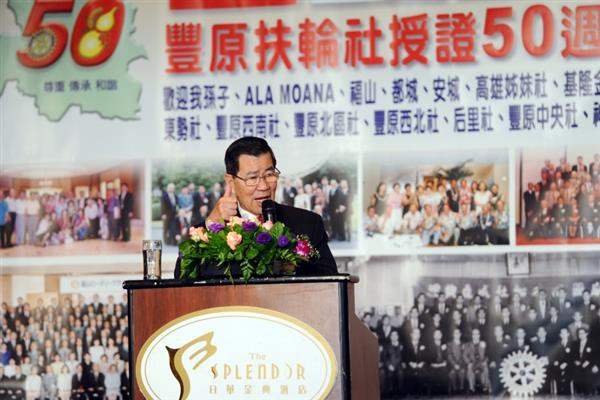 今天非常高興來參加「豐原扶輪社授證50週年」的慶祝活動,與各位一起來慶祝豐原社50歲的生日,首先向各位說聲:「生日快樂!」。