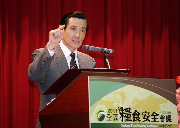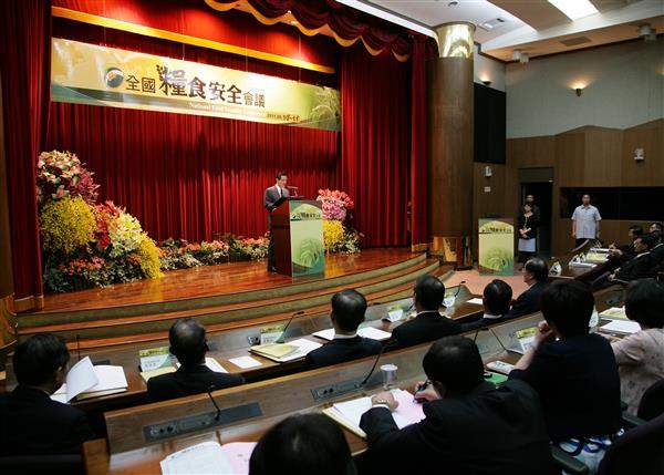 總統致詞表示,近年來全球氣候變遷,不僅使糧食安全成為重要的國家安全問題,也對我國的農業生產造成負面影響,因此,政府提出三項糧食安全政策以為因應,包括:第一、增加糧食生產,將我國以熱量計算的綜合糧食自給率,由目前的32%提高到2020年40%的目標,以因應國人麵粉消費比重逐年增加的現象;第二、推動活化利用農地策略,增加糧食供應,同時鼓勵國人多吃米食,因為「每人每天多吃一口飯」就能讓台灣5千6百公頃的土地復耕,希望各縣市多舉辦推廣米食的活動;第三、掌握糧食進口來源,加強國際農業投資與合作,另針對我國進口糧食如黃豆、小麥、玉米、糖、高梁等,評估其在國內及國外栽種的可能性。