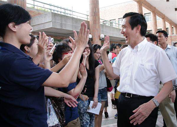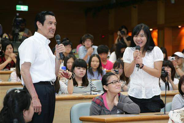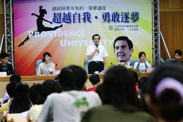 馬英九總統上午前往台中靜宜大學參加「總統與青年有約-築夢講座」,以「超越自我 勇敢築夢」為題進行專題演講,期勉年輕人築夢時,要先確定態度並充實知識,也要精進自我能力以逐步實現夢想。