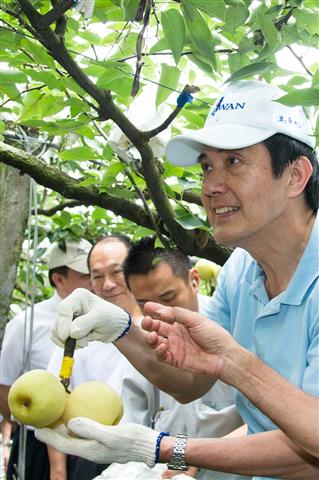 馬英九總統今天前往宜蘭縣訪視五結鄉田區稻農收穫及三星鄉高接梨產銷情形,除實地視察五結鄉稻作機械收割情況、親自採收高接梨,並與稻農、梨農座談,傾聽農民心聲、瞭解農民需求。