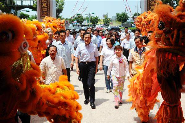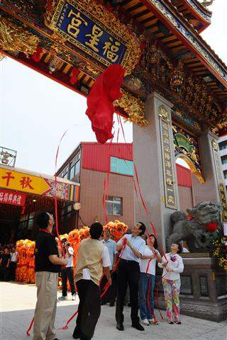 馬英九總統上午前往北投福星宮參加新建牌樓落成揭牌儀式,並祈福參拜;總統也贈送「霈澤孚祐」匾額,祈祝福星宮香火鼎盛。