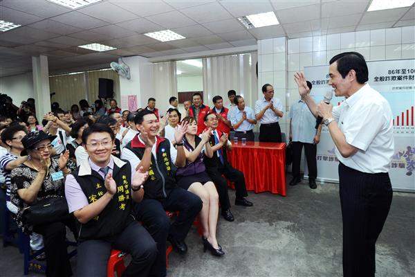 對於國內詐騙犯罪情形,總統則展示「86年至100年全國詐欺案件財損趨勢圖」及「86年至100年全國詐欺案件發生數趨勢圖」,說明政府打擊犯罪的成果。