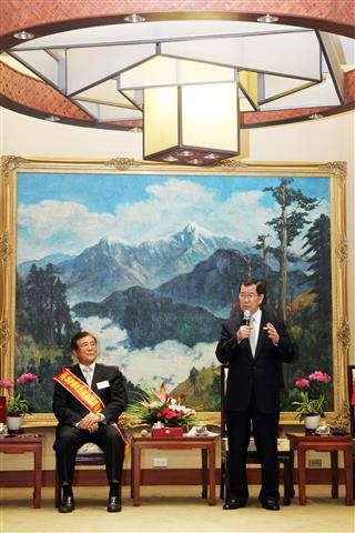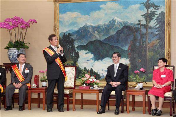 訪賓一行由環球購物中心董事長馬玉山帶領、經濟部次長梁國新陪同,前來總統府拜會副總統。
