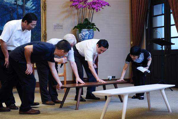 總統也現場體驗丹麥製椅大師韋格納(Hans Wegner) 製作的 The Chair與「衝浪板凳」、品嚐獲得2011年世界菸酒評鑑會金牌獎的陳年高粱酒,以及使用強光放大鏡欣賞藏色天目茶碗所呈現的色澤。在聽取訪賓介紹各作品後,總統表示,無論是藏色天目茶碗、台灣原窖6年陳年高粱酒及「衝浪板凳」,都符合過去他一直所提倡的「具有台灣特色的中華文化」,這也是台灣工藝達人所展現的共同特色,令人感動。