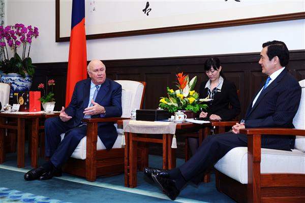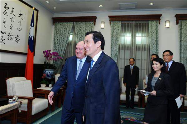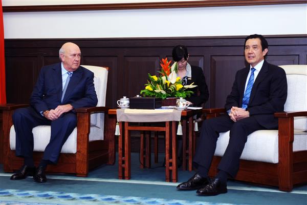 戴克拉克前總統與「戴克拉克基金會」執行長David Whitefoord Steward上午由外交部常務次長沈斯淳與「財團法人中華民國建國一百年基金會」執行長盛治仁陪同,前來總統府晉見總統,國家安全會議秘書長胡為真也在座。