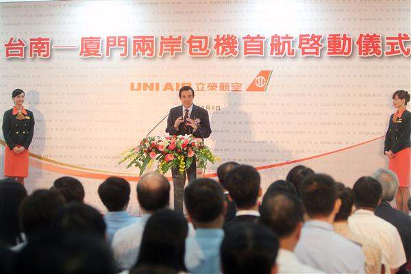 馬英九總統上午出席「臺南機場直飛廈門機場首航典禮」,期盼透過中央與地方政府,以及航空、旅遊業者的共同努力,為臺南帶來更多商機,促進地方的繁榮發展。