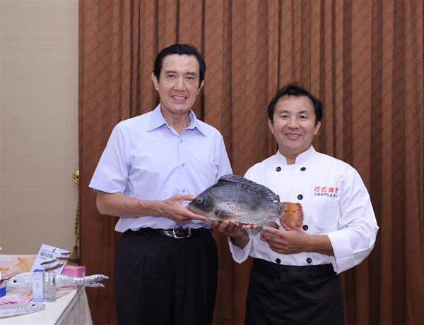 馬英九總統中午在總統府接見臺灣鯛料理達人李宗銘、虱目魚女王盧靖穎及其家人;並在兩位達人分享各自的人生故事及產品理念後,也品嚐虱目魚丸及臺灣鯛金沙魚丸。