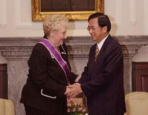陳總統水扁先生今天頒授「紫色大綬景星勳章」給「空中英語教室」廣播教學節目創辦人彭蒙惠女士,以表彰她熱愛台灣的偉大情操以及長期為台灣所奉獻的心力。