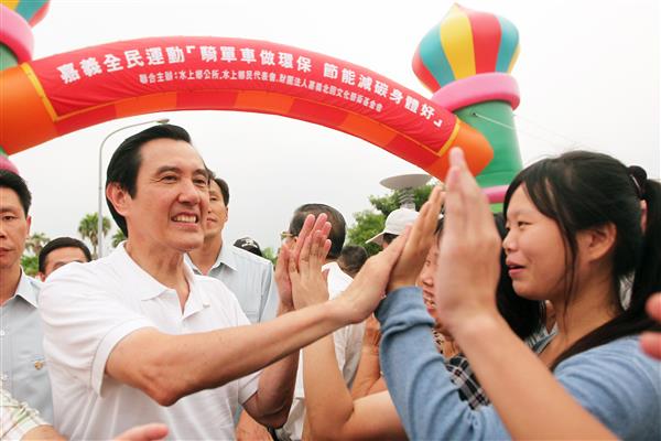 稍早,總統至嘉義縣水上鄉北回公園為「騎單車做環保,節能減碳身體好:千人單車繞行嘉義縣市」活動加油打氣。總統抵達會場後,受到在場參與活動鄉親的熱烈歡迎,總統並逐一與出席民眾及單車騎士擊掌,以實際行動表達政府對全民運動風氣與節能減碳理念的支持。