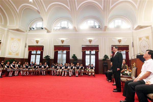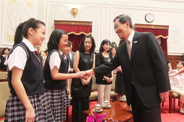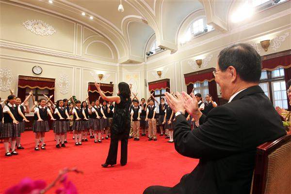 蕭萬長副總統上午接見臺北市私立復興實驗高級中學青少年合唱團團員,對團員們榮獲「第一屆世界青少年合唱錦標賽」金牌獎,提升臺灣國際能見度,表達恭賀與嘉許。