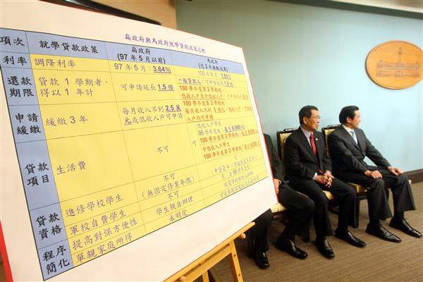 馬英九總統上午在總統府召開「青年安心就學」記者會,宣布將放寬就學貸款措施包括延長還款期限、放寛申請緩繳門檻,及放寬低收入戶與中低收入戶的生活費貸款,以減輕弱勢學生的經濟壓力。