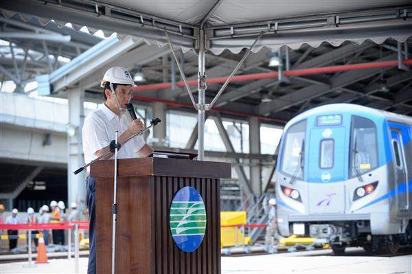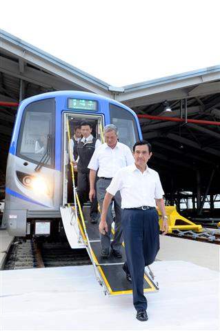 稍後,總統前往捷運機場青埔機廠領航站視察桃園國際機場聯外捷運系統建設進度,並進入機場捷運首列電聯車內,實地瞭解車廂設計與運作設備。