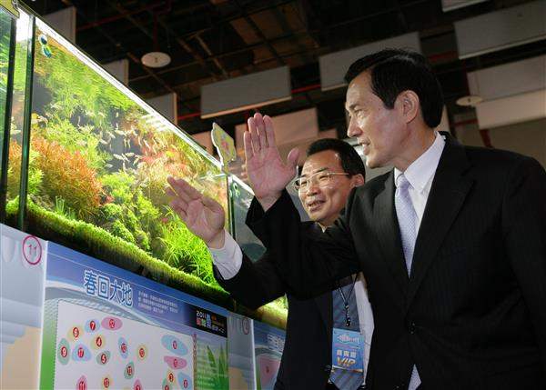 馬英九總統上午出席於臺北世貿展三館舉辦的「2011臺灣國際觀賞魚博覽會」,與行政院農委會副主委胡興華、漁業署署長沙志一等共同主持揭幕儀式,並期勉臺灣的觀賞魚養殖業「魚躍國際」。
